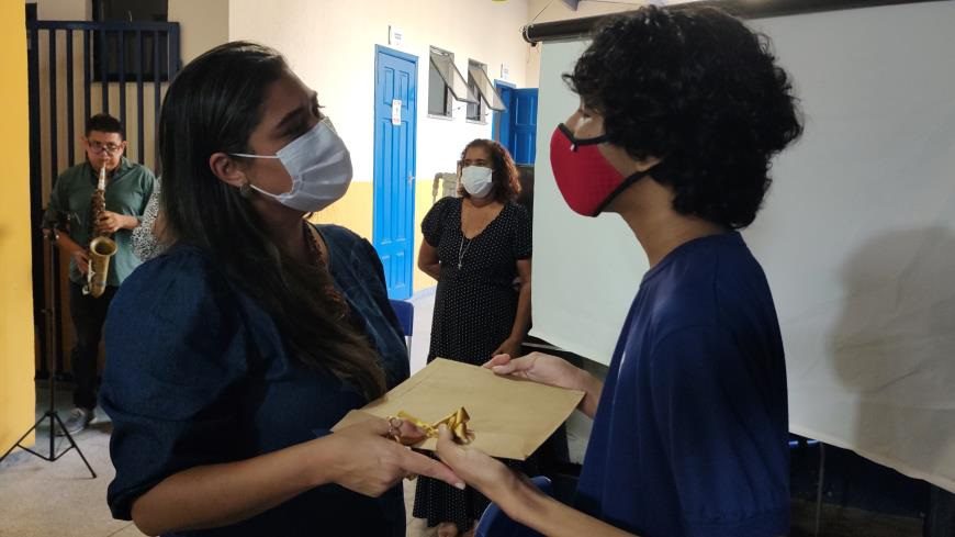 Anthony recebendo um prêmio na escola em que concluiu o ensino médio – Foto: Leandro Müller – Ascom Semec